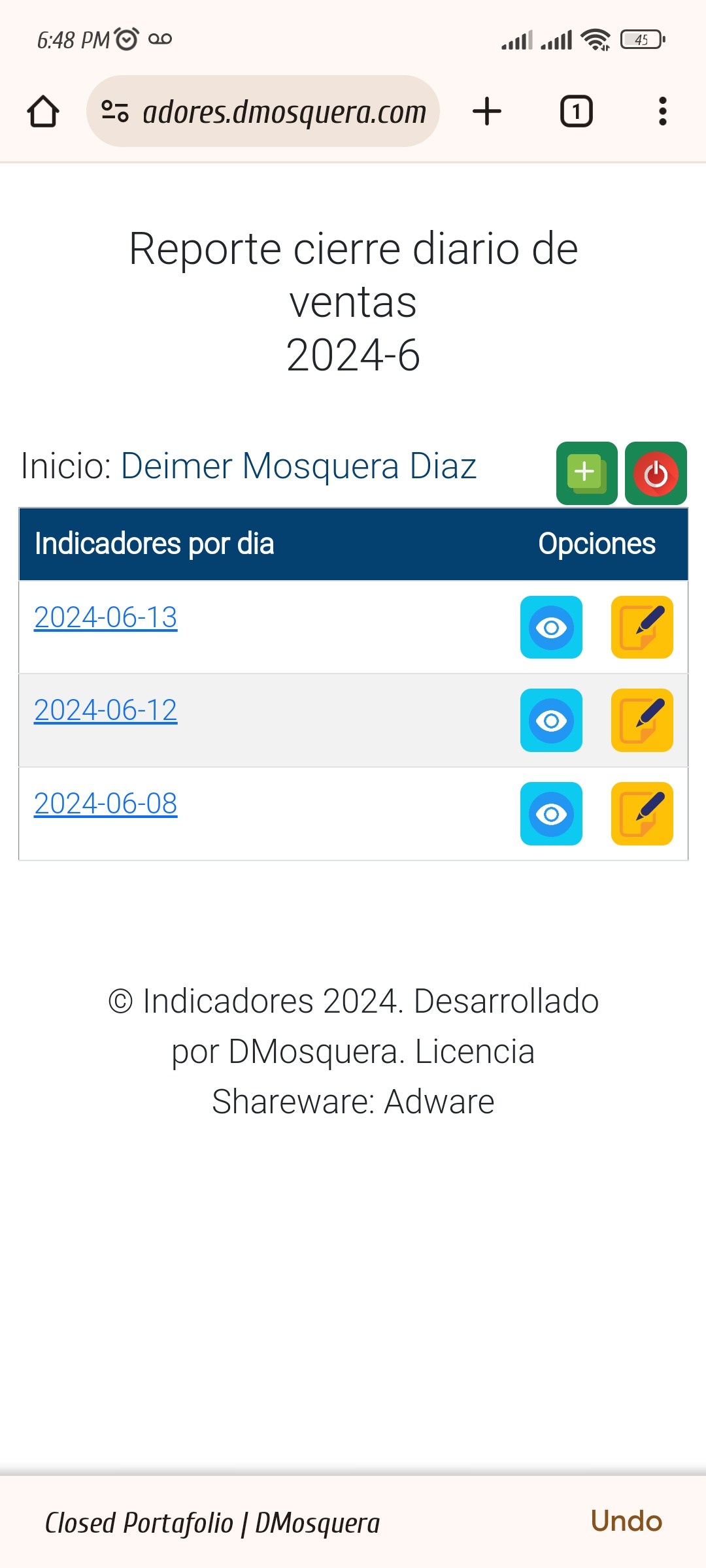 Muestra los indicadores por día para el mes seleccionado al iniciar sesión. Cada dia el vendedor podra diligenciar sus indicadores haciendo clic en el icono amarillo:
