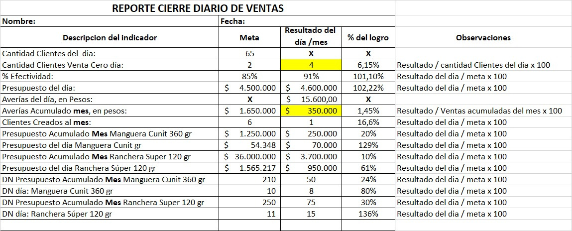 Trabajo como asesor comercial para una empresa de distribución de productos de consumo masivo y el gerente en pro de mantener plenamente consciente a sus vendedores sobre los indicadores de ventas y el como van en cada métrica, diseño un cuadro para imprimir y calcular manualmente cada indicador. Todos los vendedores debíamos hacerlo. Este es el cuadro: